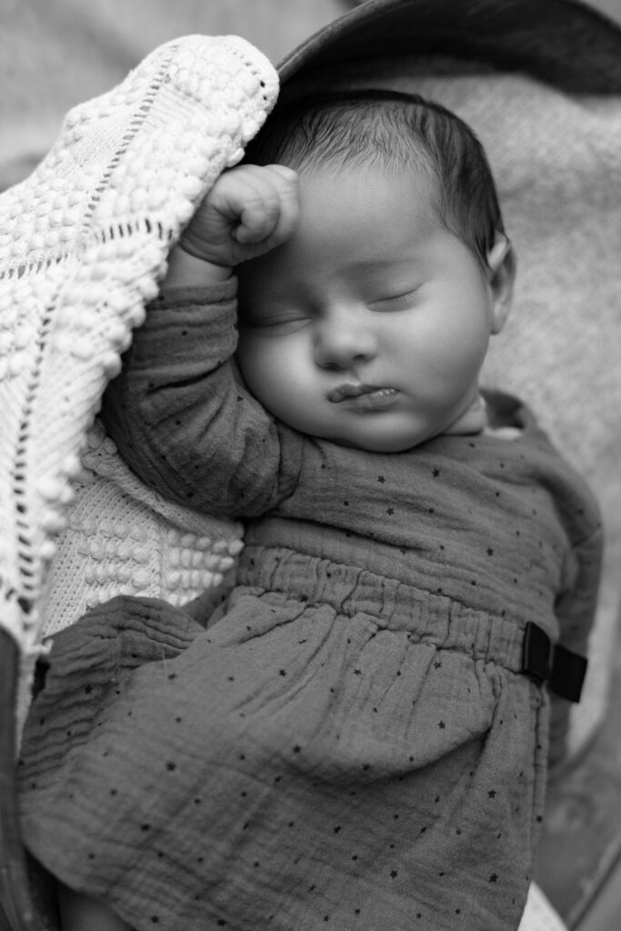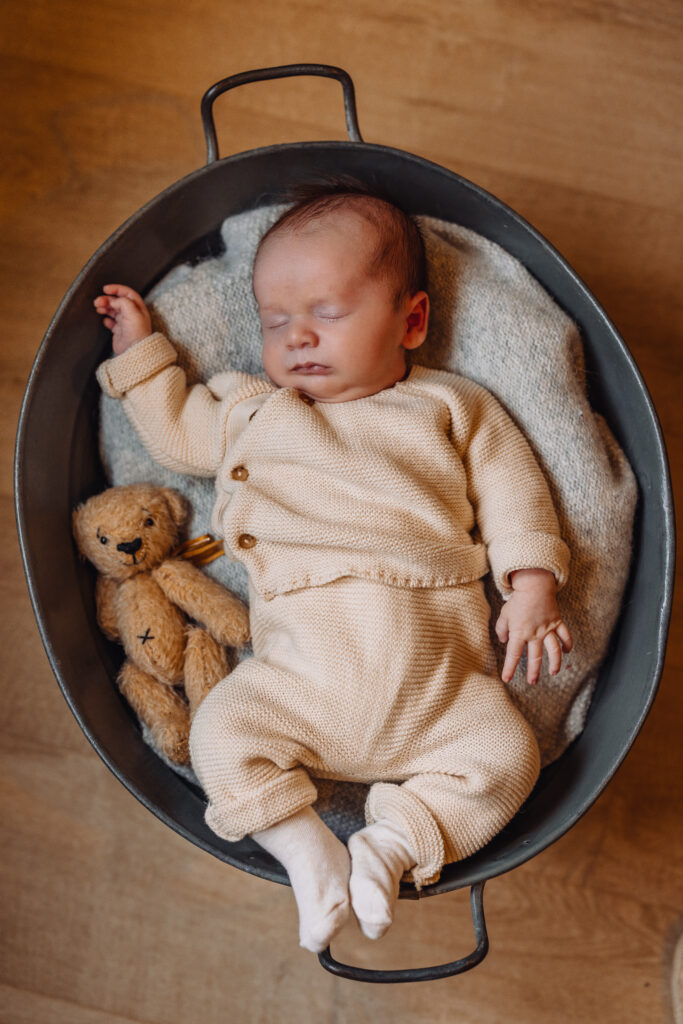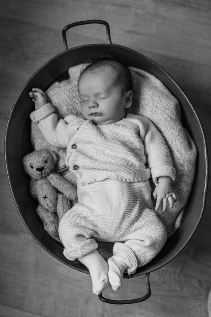 Dans le lit de bébé ou dans les deux contenants que je mets à votre disposition (bassine en zinc ou valise). Des portraits doux dans des poses naturelles de votre bébé.