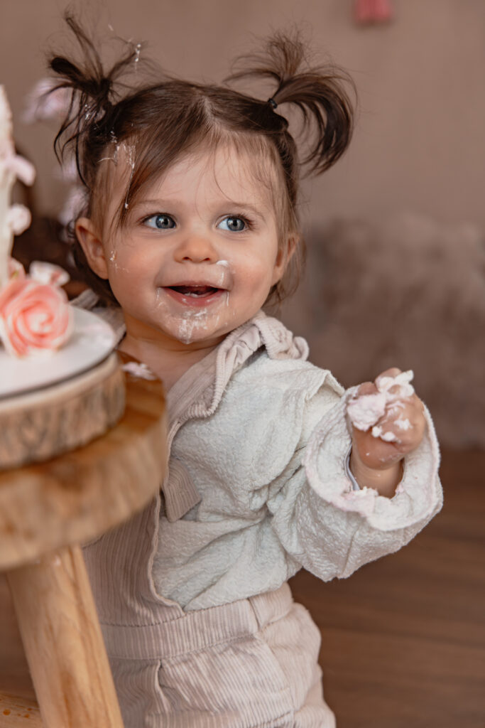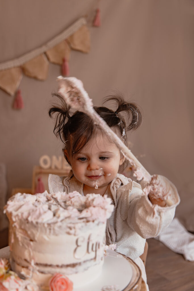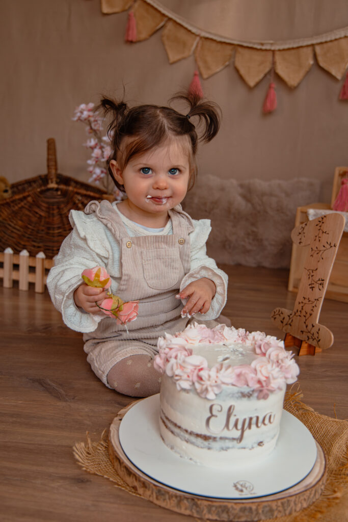 our son premier anniversaire, la petite Elyna a vécu une séance Smash the Cake près de Nantes, dans une ambiance douce, chaleureuse et cocooning.